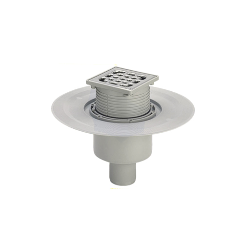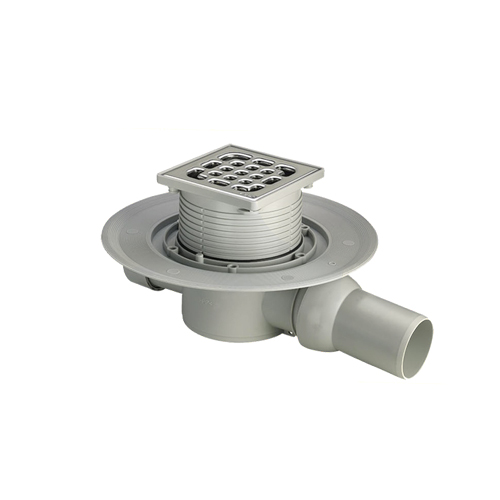 Top 100x100mm rotatable and height-adjustable, plastic frame, stainless steel 1.4301 grate, plug, sealing flange, removable odour trap.