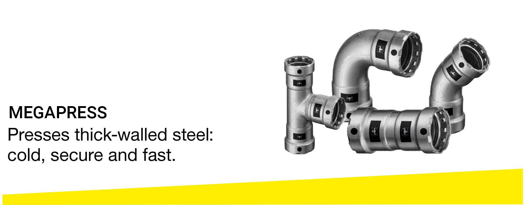 MEGAPRESS Whether thick or thin-walled, painted or galvanized, coated or black-steel pipes can be used in a wide range applications, have long service lives and are particularly robust. So it is a good thing has come up with yet another genuinely innovative technology: Megapress, This system means that steel pipes can now make economic sense in heating, cooling or industrial plant. applications.